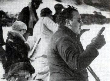 Hitchcock egy korai produkciós fényképen: rendez - mögötte jobbra, Alma Reville - jövendőbeli felesége