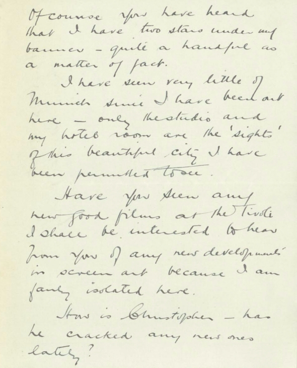 I expect that you have given up all hope of ever hearing of me, that is to say if you ever did want to. However, when I tell you that I haven’t written my own mother but twice since I have been away, you will see how I am entirely concentrated on The Pleasure Garden. I am very pleased to hear that The Prude’s Fall has come out of your ‘film hospital’ a new being. How did the Blunderland picture turn out? Was the native guide a success in the form of Jock Orton? Of course you have heard that I have two stars under my banner – quite a handful as a matter of fact. I have seen very little of Munich since I have been out here – only the studio and my hotel room are the ‘sights’ of this beautiful city I have been permitted to see. Have you seen any new good films at the Tivoli? I shall be interested to hear from you of any new developments in screen art because I am fairly isolated here. How is Christopher – has he cracked any new ones lately? Would you please give my best regards to Mrs Brunel and Babs and accept same yourself. With kindest regards and hope to see you soon. Yours sincerely, |