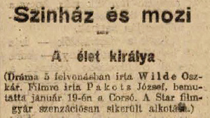 -A magyar adaptáció sajtóbemutatója 1917. október 23-én volt szintén az Uránia moziban, akkor még Dorian Gray arcképe címen hirdették a filmet, később azonban Az élet királya címen forgalmazták.