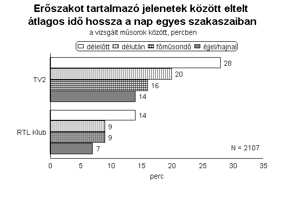 Az adatok egy másfajta megközelítése azt is elárulja, hogy az RTL-nél nem csupán az erőszakos jeleneteket tartalmazó műsorszámok aránya volt magasabb, hanem az agressziót prezentáló jelenetek összesített hossza is. A két vizsgált héten az RTL Klubon több mint 17 órán keresztül sugároztak erőszakos jeleneteket, a TV2-n valamivel kevesebb, mint 12 órán át. A két időszak valamennyi műsorsávjában az RTL-nél volt magasabb az erőszakos jelenetek bemutatásával eltöltött műsoridő mértéke. E televízió műsoridejének 13 százaléka tartalmazott agresszív jeleneteket, a TV2-n ugyanez az arány 7 százalékot ért el.