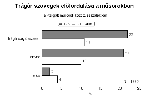 Ugyancsak gyakrabban fordultak elő a TV2-ben trágárságok (4. ábra, 3. táblázat). E csatorna műsorainak 22 százalékában használtak ilyen kifejezéseket, az RTL-nél viszont csak minden tizedik műsorszámban. Az eredmények arról is tájékoztatnak, hogy a trágár kifejezések inkább az enyhe kategóriába sorolhatók, súlyosabb káromkodásokkal, nemi szervekkel kapcsolatos megnyilvánulásokkal ritkán találkozhattak a nézők.