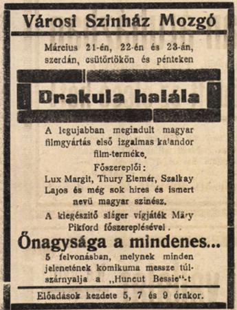 Az eredeti bemutatót követően Magyarországon csak 1923.márciusában mutatták be a Drakula halálát.