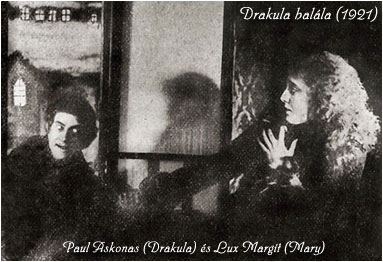 Drakula halála (1921), translated as "Dracula's Death / The Death of Dracula" was the very first film adaptation of the famous novel by Bram Stoker called Dracula (1897.) instead of F.W. Murnau's classic Nosferatu (1922). This film directed by Lajthay Karoly; produced by Corvin Filmgyar [Corvin Film Company], and the title role played by Paul Askenas and Lene Myl. This film premiere was in Febr.1921. (Wien). This film is presumed lost...
