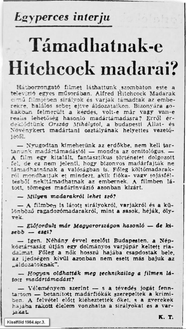 (Kisalföld napilap - , 1984.ápr.3. szám) Köszönet a cikkért Cs.Sándor-nak! :) [Vissza a Hitchcock kezdőoldalra!]