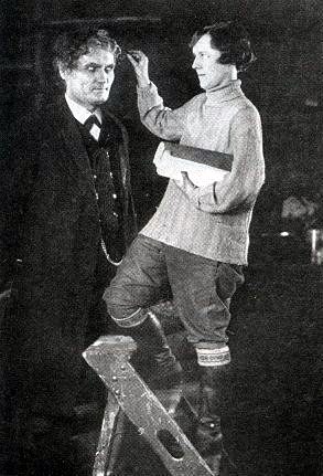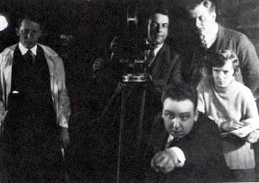 Hitchcock egy korai produkciós fényképen: rendez - mögötte jobbra, Alma Reville - jövendőbeli felesége