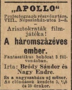 The Three-Hundred-Year-Old Man is the reconstruction of a lost silent film made in 1914 on the basis of an album of 66 photographs kept in the Film Archive. The 50-minute silent film was made to raise money for charity: the aristocratic group initiating the making of the film exploited the popular medium of film to promote a new achievement, aviation. The screenplay was written by Sándor Bródy and Endre Nagy, its actors were young Hungarian aristocrats, many of whom later became notable personalities. Money raised from the film was to go to improve Hungarian aviation and the Polyclinic.
