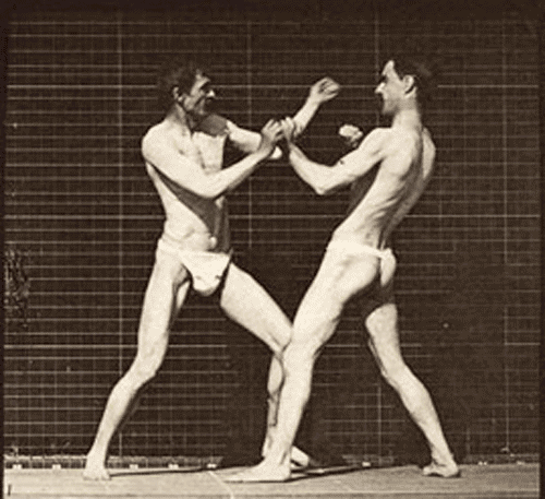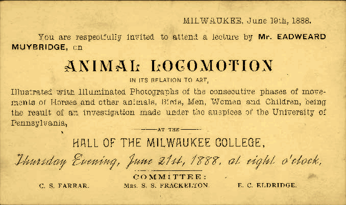1878-ban, Stanford ismételt anyagi támogatásával Muybridge tizenkét kamerát állított egymás mellé, amelyek egymástól eltérő időben exponáltak, amikor a vágtató ló az adott kamera előtt haladt el (az exponálást a pályán elhelyezett vezetékek elektromos úton indították). A felvételek készítésének pontos idejét egy kronográf ezredmásodperces pontossággal mérte. A fotóknak köszönhetően kiderült, hogy ló mind a négy lába akkor van levegőben, amikor maga alá húzza, és nem amikor kinyújtja. A Stanforddal való szakítás után lehetséges támogatókat keresett munkája folytatásához. Erre a Pennsylvania Egyetem vállalkozott, akik laboratóriumot és felszerelést biztosítottak számára az egyetem területén. 1884 és 1886 között 781 sorozatképet készített. Ez a munkája 1887-ben tizenegy kötetben jelent meg Animal Locomotion címmel (több mint húszezer felvétellel), mozgó emberekről és állatokról. A modellek többsége férfi volt, többnyire a Pennsylvania Egyetem hallgatói, akik az általuk bemutatott sportágban (birkózás, futás, súlylökés, távolugrás, baseball, vívás, stb) kiemelkedő eredményt értek el. A nők művészek modelljei voltak. Több sorozatképet egyszerre két vagy három nézőpontból rögzített.