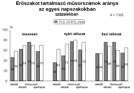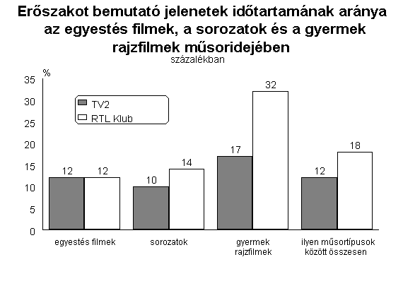 Elöljáróban leszögezhetjük, hogy az RTL műsorszámai között gyakrabban tűntek fel olyanok, amelyekben tetten érhető volt valamilyen erőszakos aktus. A két időszak összevetéséből kiderült az is, hogy ez a különbség elsősorban a nyári műsorhét kínálatának volt köszönhető. Ennek minden bizonnyal az a magyarázata, hogy nyáron az emberek kevesebbet televízióznak, így az erőszak egyfajta nézőcsalogatónak számít. Ekkor az RTL műsorszámainak 63 százalékában volt olyan jelenet, amelynek cselekménye agresszivitást tartalmazott, a TV2-nél ez az arány “csak” 45 százalékot tett ki. Lényegesen kisebb különbséget regisztráltunk a két csatorna között novemberben. Igaz, ekkor is az RTL Klub műsoraiban találtunk nagyobb arányban erőszakos jeleneteket, ám a két médium közötti különbség mindössze négy százalékra csökkent. Az RTL műsorválasztéka mindenekelőtt a hétköznapokon sugárzott műsorai miatt tekinthető erőszakosabbnak konkurensénél. Hétvégén nagyjából azonos arányban fordultak elő agresszív tartalmú műsorok a két műsorszolgáltatónál. További hasonlóságot jelent a csatornák között, hogy az egyestés filmekben volt a legnagyobb az erőszak mértéke. Az RTL Klub ebben a tekintetben is felülmúlta vetélytársát, hiszen ezen filmjeinek több mint 90 százalékában volt legalább egy agresszív aktust bemutató jelenet, a TV2 filmjeinek viszont “csak” háromnegyedéről mondható el ugyanez. Az RTL kínálatában ráadásul a sorozatokban és gyerekrajzfilmekben is gyakrabban bukkantak fel erőszakos műsorok.