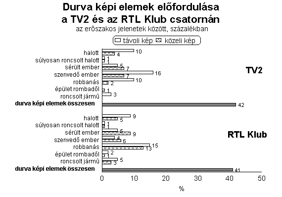 Vizsgálatunk eredményei azt mutatják, hogy az RTL Klub műsorkínálatának erőszaktartalma magasabb, mint a TV2-é. Ez a következtetés leginkább azon alapul, hogy az RTL műsoraiban gyakrabban voltak agresszív aktusokat is bemutató műsorszámok, valamint az erőszak műsorideje is nagyobb volt, mint a vetélytársnál. Az erőszakos jelenetek prezentálásának vizsgálata arról is árulkodik, hogy a TV2-n az agresszió bemutatása valamivel naturálisabban történt. Ezen a csatornán többször láthattak a nézők gyilkosságot vagy gyilkossági kísérletet, de kétszer gyakoribbak voltak azok a műsorrészek is, amelyek az agresszivitást durvábban jelenítették meg, azaz, amelyek sérüléseket, emberi szenvedéseket nem csak utalásszerűen, hanem részletesen is bemutattak (az agresszív jelenetek 18 százalékában történt ilyen). A naturálisabb erőszak-ábrázoláshoz tartozik, hogy a TV2 erőszakos jeleneteiben rendszeresebben voltak láthatók halott és sérült emberek.