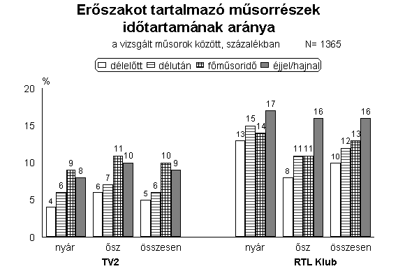 Az RTL-nél szinte valamennyi műsorsávban gyakoribbak voltak az erőszakot tartalmazó programok, mint vetélytársánál, de e különbség különösen szembetűnő a nyári hét délelőtti műsorsávjában. Ez azért is feltűnő, mert a vakáció miatt ekkor az átlagnál több fiatalkorú néző ült a tévékészülékek előtt. Ebben az időszakban az RTL délelőtt sugárzott műsorszámainak 72 százaléka tartalmazott agressziót, a TV2-n ugyanez a mutató “csak” 30 százalékot ért el.